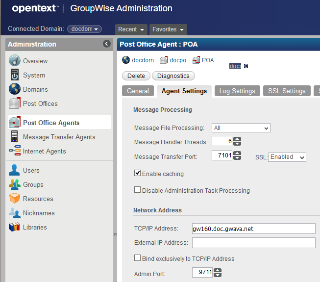Log in to the Groupwise Administration Console, and navigate > Post Office Agents > selected POA > Agent Settings > Network Address > Host Name.