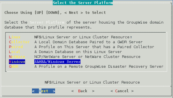 Select the server platform Linux: NFS/Linux Server or Linux Cluster Resource. [Yes, the GroupWise server is Windows, but the share is NFS, which is the important part].