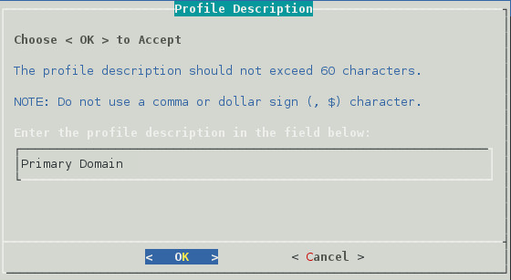 Give the profile a description. The profile description should not exceed 60 characters and should not have comma(,), nor dollar sign($) characters. For example: Primary Domain