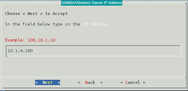 Select the SAMBA/Windows server address type: 1 TCP/IP Address or 2 DNS Address.