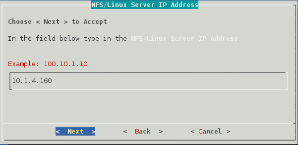 Select the NFS/Linux server address type: 1 TCP/IP Address or 2 DNS Address.