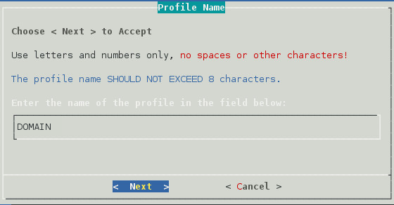 Give the profile a name. The profile name should not exceed eight characters. Use letters and numbers only, no spaces or other characters. For example: Domain