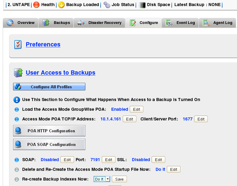 Browse to GroupWise Disaster Recovery Web Administration Console | <Profile> | Configure| User Access to Backups panel | POA SOAP Configuration section | Re-create Backup Indexes Now | Do It and press Save