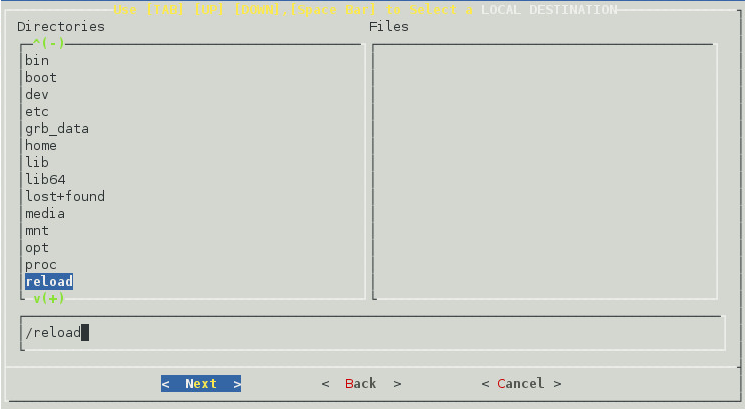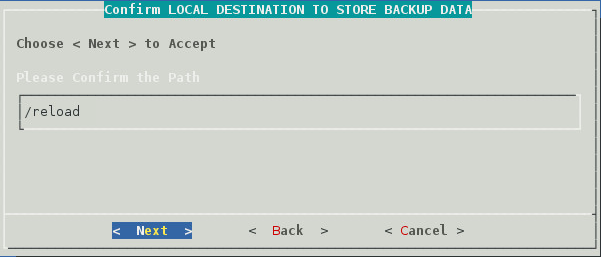 Enter the path or browse to the local destination directory to store the backup data. For example: /reload. This path can be a location on the Linux server, or an NFS mount to another Linux/Unix server, or to a SAN. The path should always be available; Reload is not configured to mount paths in order to access stored data. Also, the path should be to a location that has a lot of disk space available. Select the Next button.