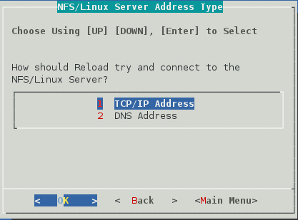 Select NFS/Linux Server Address Type: "1 (TCP/IP Address)" or "2 (DNS Address)"