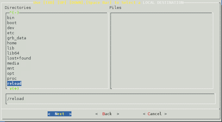 Enter the path or browse to the local destination directory to store the backup data. For example: /reload. This path can be a location on the Linux server, or an NFS mount to another Linux/Unix server, or to a SAN. The path should always be available; Reload is not configured to mount paths in order to access stored data. Also, the path should be to a location that has a lot of disk space available. Select the Next button.
