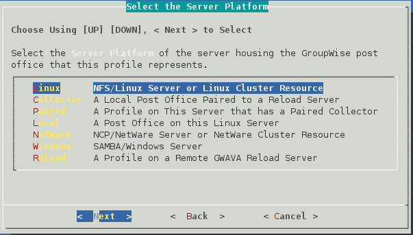 Select the Server Platform: "Linux (NFS/Linux Server or Linux Cluster Resource)" [Yes, the GroupWise server is Windows, but the share is NFS, which is the important part]