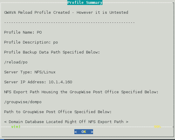 Give the Profile a Name. The profile name should not exceed eight characters. Use letters and numbers only, no spaces or other characters. For example: Post Office. Be aware, that a profile cannot be renamed, once it has been created. Choose the name wisely. Perhaps you will want to name the profile so that its name is the same as the GroupWise post office or domain that the profile represents. Select the Next button.