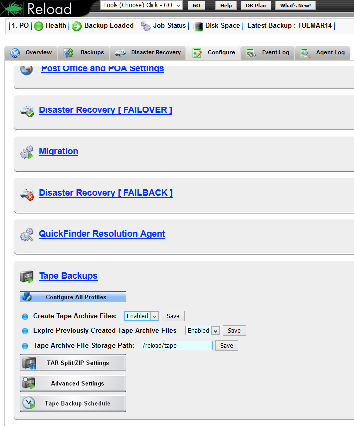 Reload can create TAR files for long term backup storage. Reload creates a single file from the previous week's worth of backups, but can be set to split it into smaller chunks that will fit the backup media. Advanced settings can be used to run bash scripts before and/or after the tape backup runs.