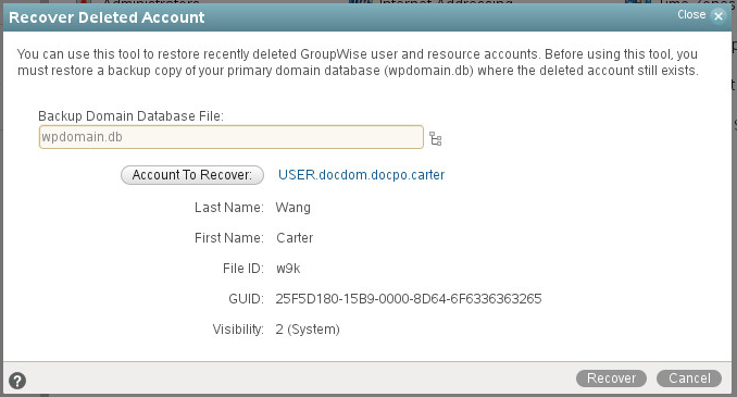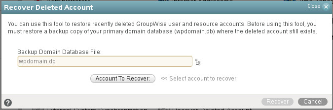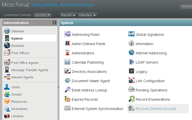 Browse to GroupWise Administration | System | Recover Deleted Account