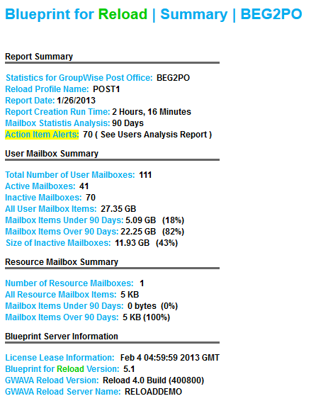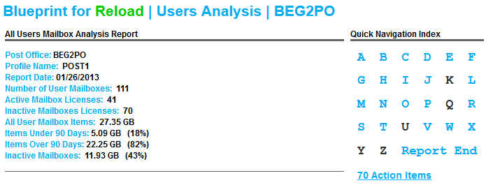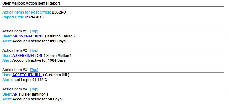 At the top of the report is a quick summary, and links to users by name and action item sections