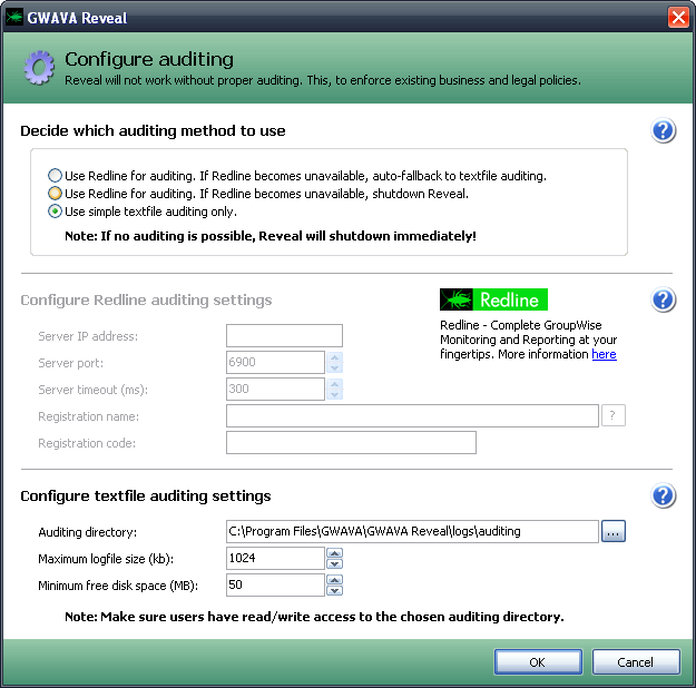 GroupWise Forensics Auditing keep logs and track of which users connect to the system, and which operations were performed, at which time. Auditing can be performed by simple text file, or GroupWise Forensics may integrate with GWAVA Redline.