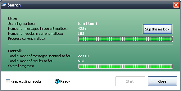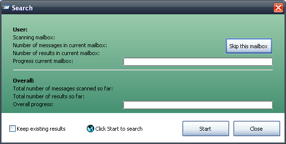 To perform a search, fill out the desired criteria and click the Execute Search button. The search window will appear and require the user to select the Start button. Searches on large mailboxes may take some time. Select the Start button to continue.