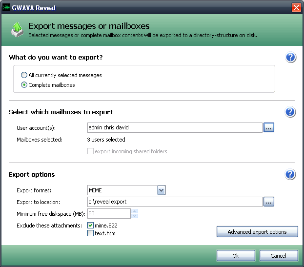 Users may also select to exclude the mime.822 and, or text.htm attachments to messages in the export list.