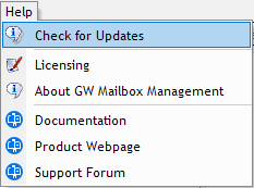 To install a license file for GroupWise Mailbox Management, first claim the license file from the website, licenses.gwava.com. Start GroupWise Mailbox Management and select Licensing from the Help menu. This will check for a license, and report on the current user status of a system.