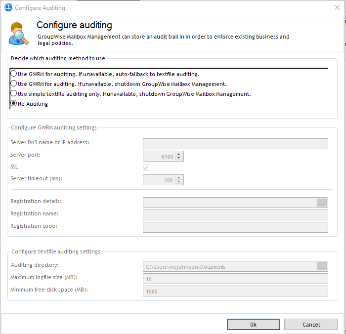 When you have finished configuration for your choice, click OK to complete. GroupWise Mailbox Management does not require a restart for Auditing to become active.