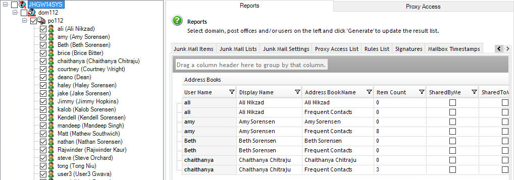The reports screen looks very similar to the single user mode screen, except that the function tabs are now sub-tabs. All of the same information that was available in the single user mode under these tabs is available here, but it will be generated according to the users selected in the tree view on the left side of the GroupWise Mailbox Management window.