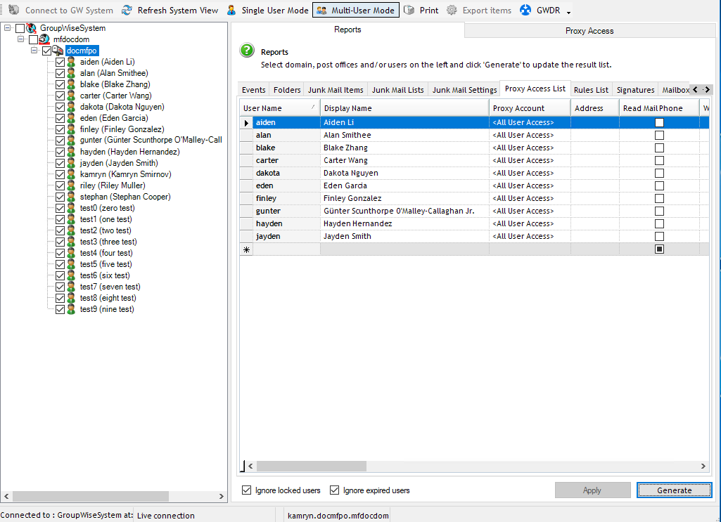 The Multi-User mode allows the selection of all or certain users to be modified at the same time. Multiple user mode has three tabs across the top of the information window; Reports, Proxy Access, and User Properties.