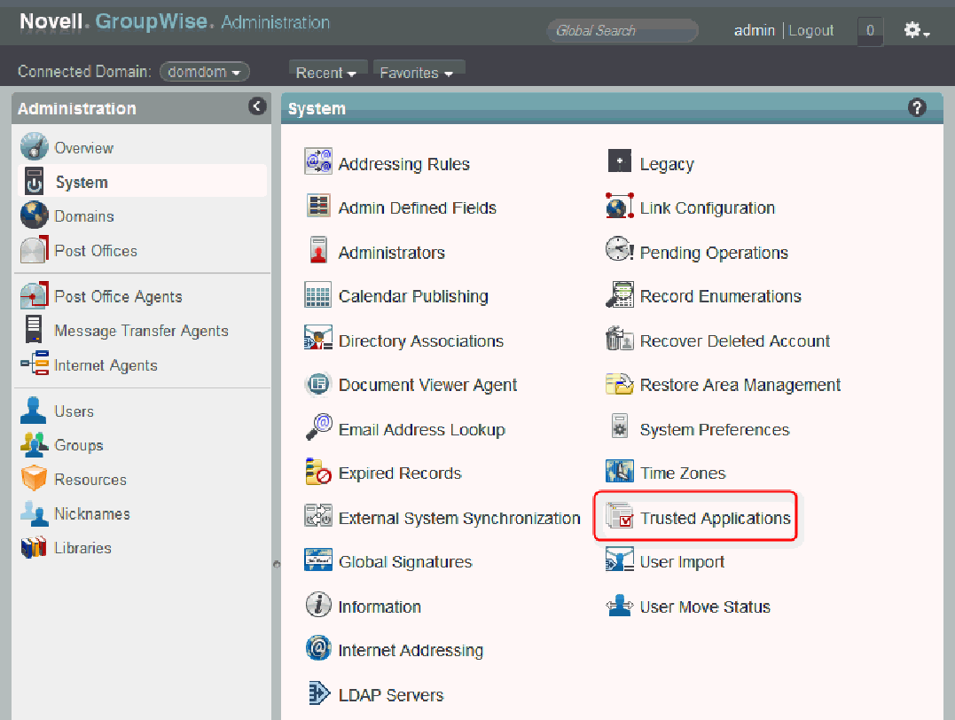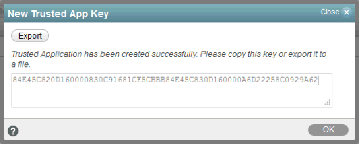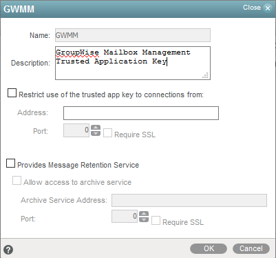 A popup for a 'New Trusted App Key' will appear. Type 'GroupWise Mailbox Management' in the 'Name' field.