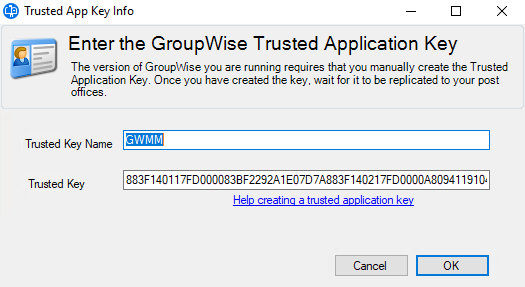 Type in 'GroupWise Mailbox Management' as 'Trusted Key Name' and paste the Trusted Application Key that was created and copied before in the 'Trusted Key' field.