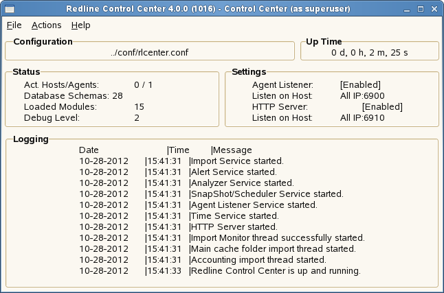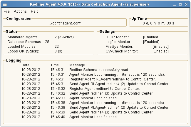 Redline on Linux can run as a background process and, mostly for debugging purposes, as a foreground process with a screen like the NetWare screen. There is a start/stop script in the folder /etc/init.d. To start the Agent, go to /etc/init.d and type ./rlagent start.