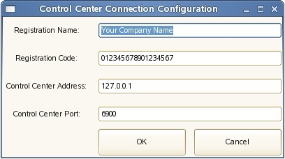 The agent configuration file (listed above) holds a ‘NEWINSTALL’ switch and requires the registration name, code, address and port for the Control Center. This can be edited manually, or, if desired, the agent may be started in the GUI. (This does not work over SSH) You will be asked for Registration Name, Registration Code, Control Center IP address and port. Everything else can be configured through the Control Center web interface.
