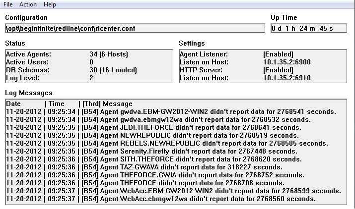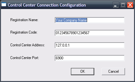 If the Agent is started the very first time and the Registration Name is still the default, you will be asked for Registration Name, Registration Code, Control Center IP address and port. If you start the Agent as a service, this dialog does not show up. Everything else can be configured through the Control Center web interface.
