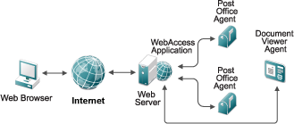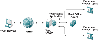 A basic installation of GroupWise WebAccess requires the WebAccess Application, a POA, and a DVA, as shown in the following diagram.