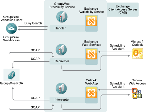The components of the GroupWise Free/Busy service (Handler, Redirector, and Interceptor) are installed on an Exchange server where the Client Access server role is installed. Each component interacts with a different component of your Exchange system. The following diagram illustrates these interactions: