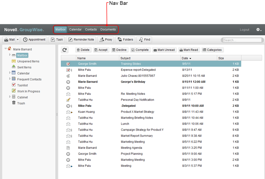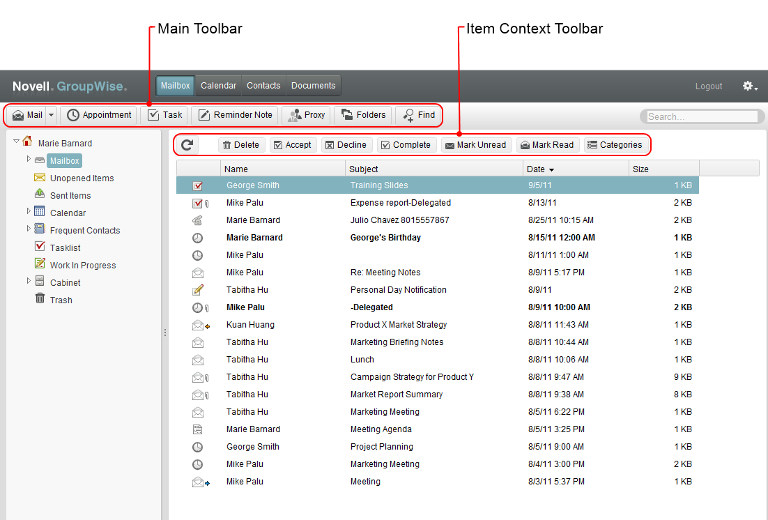 Your main work area in GroupWise is called the Main Window. From the Main Window of GroupWise, you can read your messages, schedule appointments, view your Calendar, manage contacts, open folders, and much more.