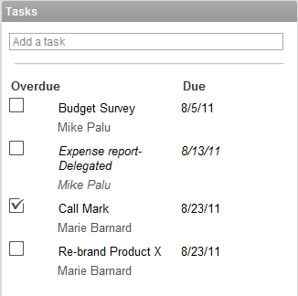 When you finish a task, you can mark it as complete. Tasks you mark as complete are not carried over to the next day on your Calendar. Completed tasks are distinguished by a check mark in your Calendar. Overdue tasks display in the section of your Tasklist.