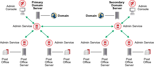 The Admin Service runs on each domain server and post office server. The Admin Service communicates with Admin Services on other GroupWise servers and with the agents that run on its local server. You can access the Admin console on any domain server. For post office access, you access the Admin console for the domain that owns the post office.
