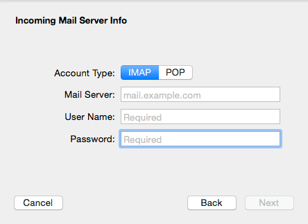 Specify the IMAP server. Your user name and password should already be filled out.