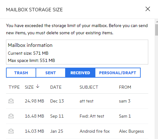 If a limit is set for your mailbox (or even if it is not), there are actions you can take directly from Mailbox Storage Size to reduce the size or your mailbox. The information is presented by four item-type buttons: Trash, Sent, Received, and Personal/Draft.