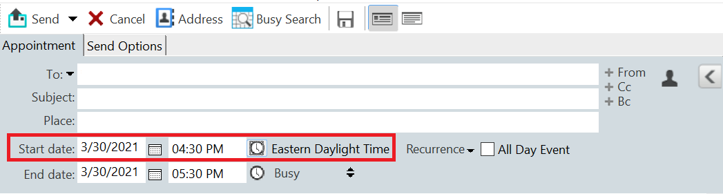 If you want to ensure that the people and resources for the appointment are available, do a busy search by clicking Busy Search on the toolbar. For more information, see Using Busy Search to Check Availability.