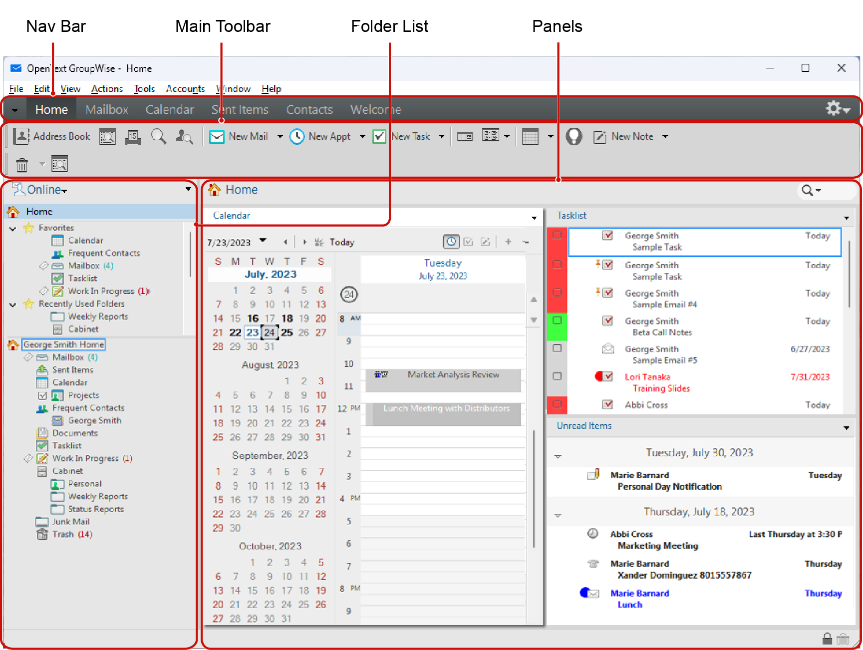 Your main work area in GroupWise is called the Main Window. From the Main Window you can read your messages, schedule appointments, view your Calendar, manage contacts, change the mode of GroupWise that you are running in, open folders, open documents, and much more.