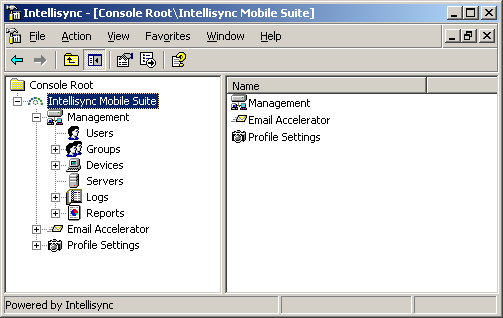 Because the Intellisync Mobile Suite control is a snap-in for MMC, you can integrate it with other MMC-compatible products. You can set up a custom console to include all your MMC-compatible products, giving you one central place to manage users for all products. Microsoft SQL Server is an example of MMC-compatible products that you can add and manage from the Intellisync Mobile Suite control.