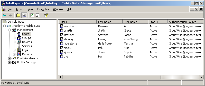 If you are using GroupWise authentication, there is no need to manually add users through the Intellisync Mobile Suite control. The feature that enables the server to recognize a new user and create a record upon the first connection is called auto discovery. Accounts created through auto discovery appear in the list of users along with all other user accounts.