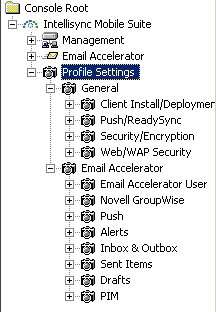 When you select , an overview of how profile settings work appears in the details pane. When you expand Profile Settings, you see a General control and a control for each Intellisync Mobile Suite product installed on your server. In addition, you might see controls for Email Accelerator.