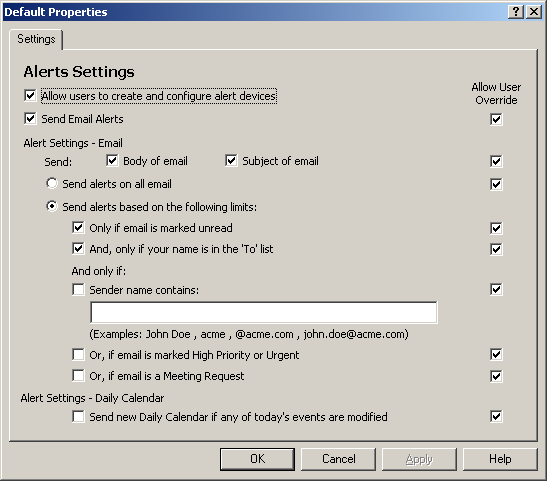 Alert Settings – Email Alerts: Select whether users should receive the body of an e-mail or only the subject in the alert.