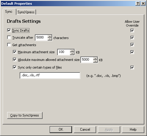 Profile settings for draft messages are similar to the Inbox and Sent Items settings, and include truncation and attachment options. There are two tabs for setting the Drafts Settings: and . The options on both tabs are identical, and the values for both Sync and SyncXpress can be set the same way. However, Sync settings are usually for a more comprehensive synchronization session. Sync sessions usually include items that require more transfer time or a faster connection. SyncXpress settings are usually for scaled-down, wireless data exchange sessions. The available settings for both Sync and SyncXpress sessions are similar to those shown in the following figure:
