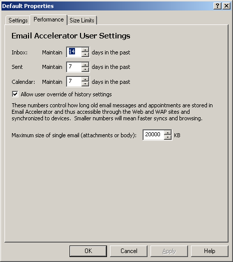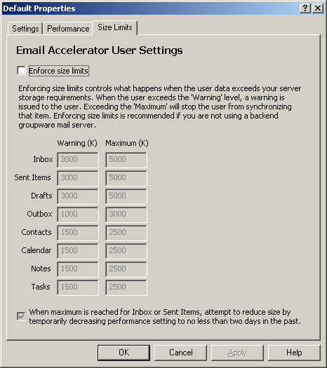 When maximum size is reached for Inbox or Sent Items: Select this option to temporarily decrease performance settings (that is, the number of days in the past for which items are stored) when the user reaches the Maximum value for Inbox or Sent folder items.