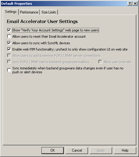 Use the Size Limits tab to control what happens when a user’s data exceeds the server storage limits.