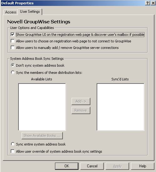 Allow user override of system address book sync settings: Select this option to allow the user to override the system address book synchronization you define here.