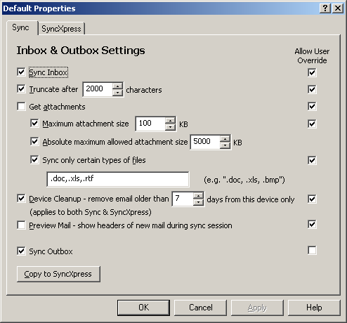 Device Cleanup – remove e-mail older than x days from this device only (applies to both Sync & SyncXpress): Specify the number of days to keep e-mail on the user’s device.