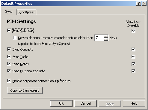 Profile settings for PIM include Calendar, Contacts, Tasks, Notes, and Personalized Information options. There are two tabs for setting PIM settings, and . The options on both tabs are identical, and the values for both Sync and SyncXpress can be set the same way. However, Sync settings are usually for a more comprehensive synchronization session. Sync sessions usually include items that require more transfer time or a faster connection. SyncXpress settings are usually for scaled down, wireless data exchange sessions.