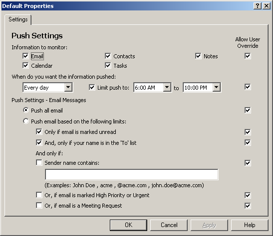 Push email based on the following limits: By selecting from the following criteria, you can set limits on the types of e-mail messages you want to receive.
