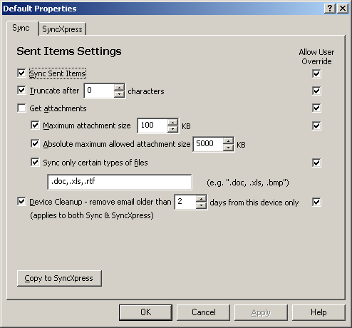 Device Cleanup – remove e-mail older than x days from this device only (applies to both Sync & SyncXpress): Specify the number of days to keep sent e-mail on the user’s device.