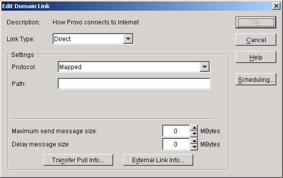 Double-click the non-GroupWise domain to display the Edit Domain Link dialog box.