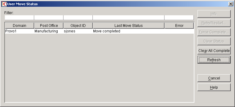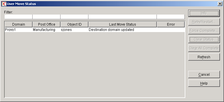 The User Move Status utility helps you track progress as you move users and resources from one post office to another. It displays the user moves associated with the object you selected before displaying the User Move Status dialog box. For example, if you selected a Domain object, all user moves for the selected domain are displayed, but not user moves for other domains.